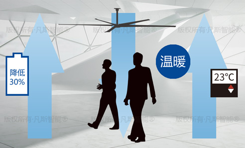 冬季采暖設備的暖空氣上升停留在屋頂,地面依然寒冷,溫度分層。大型吊扇可將屋頂的高溫氣流與下層低溫氣流攪動均衡,提高制暖率。
